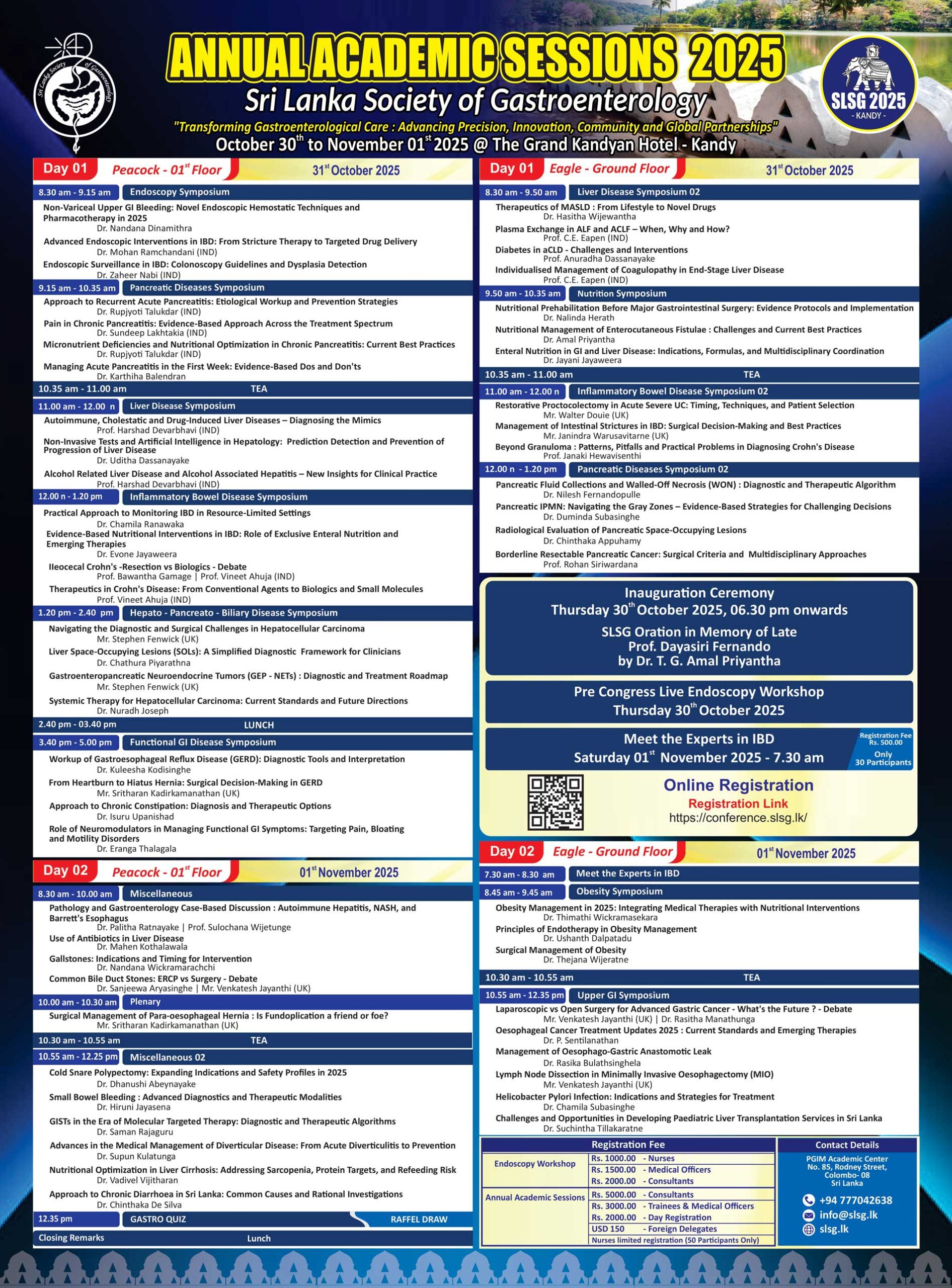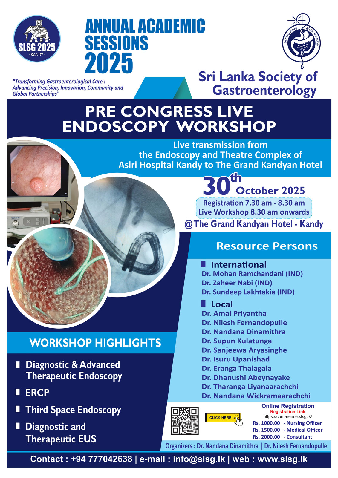 The Sri Lanka Society of Gastroenterology (SLSG) is the nation’s premier organization dedicated to advancing Gastroenterology and Hepatology. Established in 1965, SLSG brings together a diverse group of specialists, including physicians and surgeons to medical excellence and innovation.